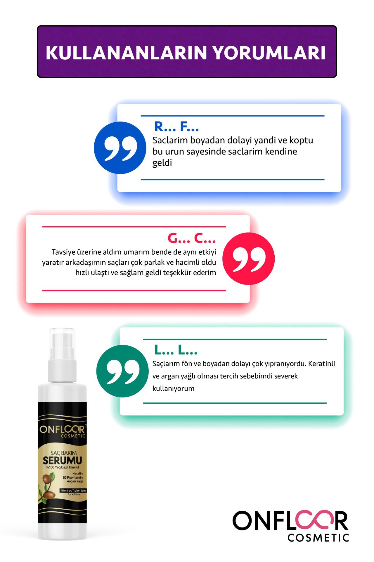 Onfloor Saç Serumu; özel formülü ile saç dökülmesini azaltmaya, saç köklerini beslemeye ve saç uzamasını desteklemeye yardımcı olur. Saçın daha dolgun, sağlıklı ve canlı görünmesini sağlar. Hafif yapısı sayesinde saç diplerinde ağırlık yapmadan emilir. Her saç tipi ile uyumludur.